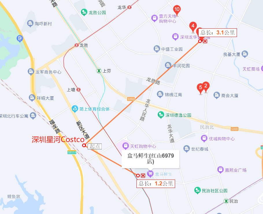 此外,龍華Costco還將直面以盒馬鮮生為首的生鮮電商。紅山6979的盒馬距離龍華Costco僅1.2公里,這家店超7000㎡,據(jù)悉是華南最大的盒馬鮮生店。