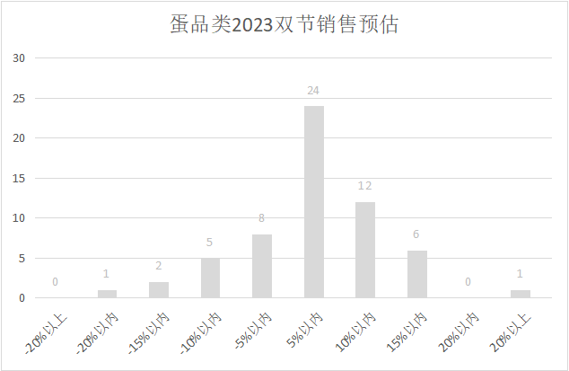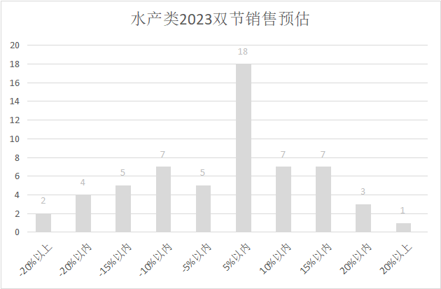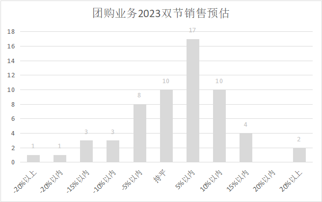 調(diào)查顯示:有39家企業(yè)預(yù)測銷售上漲(占比66%),20家企業(yè)預(yù)測銷售下跌(占比34%),預(yù)估銷售的中位數(shù)與眾數(shù)都為增長5%,平均值為2.54%。預(yù)測情況來看,半數(shù)企業(yè)預(yù)期銷售增長幅度較穩(wěn)定。節(jié)日送禮可能拉動部分增長,但不及春節(jié)假期。預(yù)判減少的原因主要與去年相比人口流動,購買頻次減少,假期出行,餐飲業(yè)態(tài)回流等因素影響。此外也與團(tuán)購業(yè)務(wù)的優(yōu)劣有直接關(guān)系。