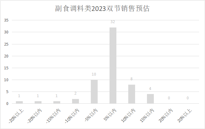 調(diào)查顯示:有45家企業(yè)預(yù)測銷售上漲(占比76%),14家企業(yè)預(yù)測銷售下跌(占比23%),預(yù)估銷售的中位數(shù)與眾數(shù)都為增長5%,平均值為5.59%。豆制品是餐桌必備食材,植物蛋白及健康概念,非節(jié)日期間也表現(xiàn)不俗。加之在家休息、假期陪伴的節(jié)日屬性,增長預(yù)期穩(wěn)定。