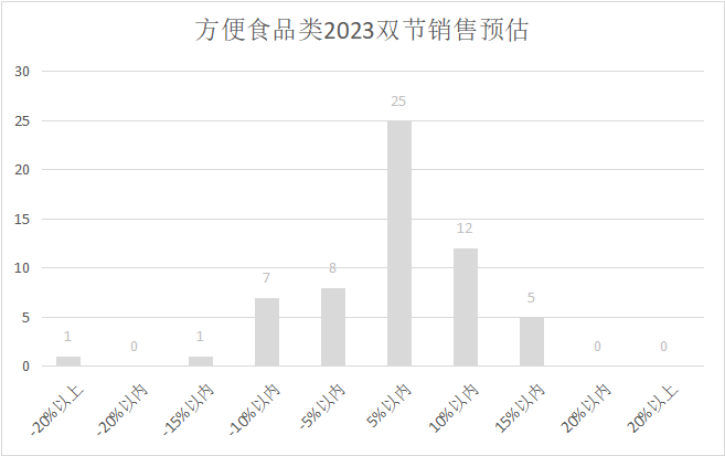 調(diào)查顯示:有42家企業(yè)預(yù)測銷售上漲(占比71%),17家企業(yè)預(yù)測銷售下跌(占比29%),預(yù)估銷售的中位數(shù)與眾數(shù)都為增長5%,平均值為2.88%。大部分企業(yè)認(rèn)為方便食品整體預(yù)估增長較為穩(wěn)定,方便面、自熱飯、餅干類商品與假期、休閑、出行具有強(qiáng)關(guān)聯(lián)性,假期效應(yīng)會帶來銷售的相應(yīng)增長,此外,消費(fèi)者對于健康的關(guān)注度提升有助于保健品及相關(guān)禮品裝走俏。