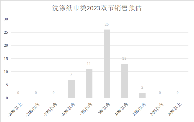 調(diào)查顯示:有41家企業(yè)預(yù)測銷售上漲(占比69%),18家企業(yè)預(yù)測銷售下跌(占比31%),預(yù)估銷售的中位數(shù)與眾數(shù)都為增長5%,平均值為2.8%。線上渠道或?qū)蛹蚁匆骂惿唐芬恢贝嬖谟绊,但雙節(jié)無論在家休息還是旅游出行,紙品、家清均有上升趨勢,增長預(yù)判較為趨同。