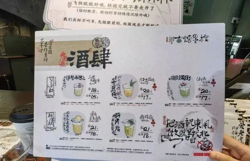 既有比較清新的檸檬茶系列,也有加入奶蓋的青檸乳茶,酒肆中有多款特調(diào)酒飲,名字也很獨(dú)特,比如“壯士且慢、斷片后”。