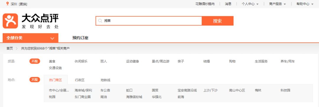 定位深圳,在大眾點(diǎn)評(píng)上搜索“湘菜”,顯示共有6968家相關(guān)商戶?紤]到疫情期間的負(fù)增長(zhǎng),疫情前這個(gè)數(shù)據(jù)要更高得多。另外,由于大眾點(diǎn)評(píng)數(shù)據(jù)統(tǒng)計(jì)可能會(huì)有遺漏,目前深圳湘菜館數(shù)量應(yīng)該已經(jīng)超7000家了。