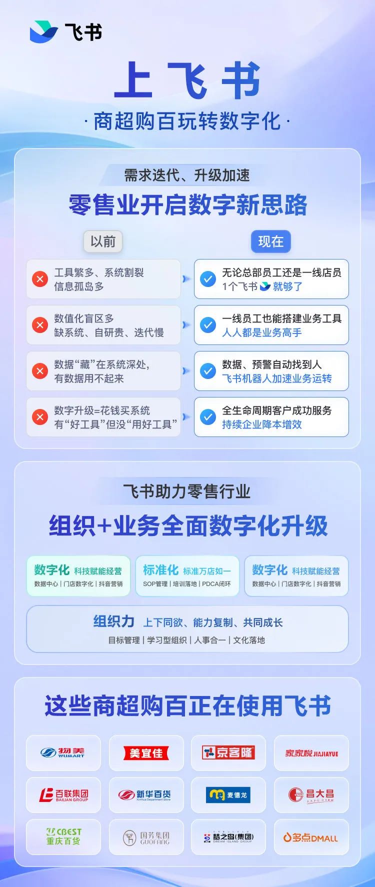 而有意思的是,在這些行業(yè)“尖子生”美宜佳、物美、重慶百貨們的背后,有個(gè)共同的神秘身影——飛書,陪伴與見證著零售商超行業(yè)的轉(zhuǎn)型,尤其是在降本增效、組織激活、業(yè)務(wù)協(xié)同和業(yè)務(wù)創(chuàng)新等細(xì)分領(lǐng)域。這不禁讓人好奇,這個(gè)一站式協(xié)同辦公平臺(tái)是如何走到線下,在一個(gè)個(gè)具體場景中,讓老零售百貨們?cè)俅巍跋冗M(jìn)”的?