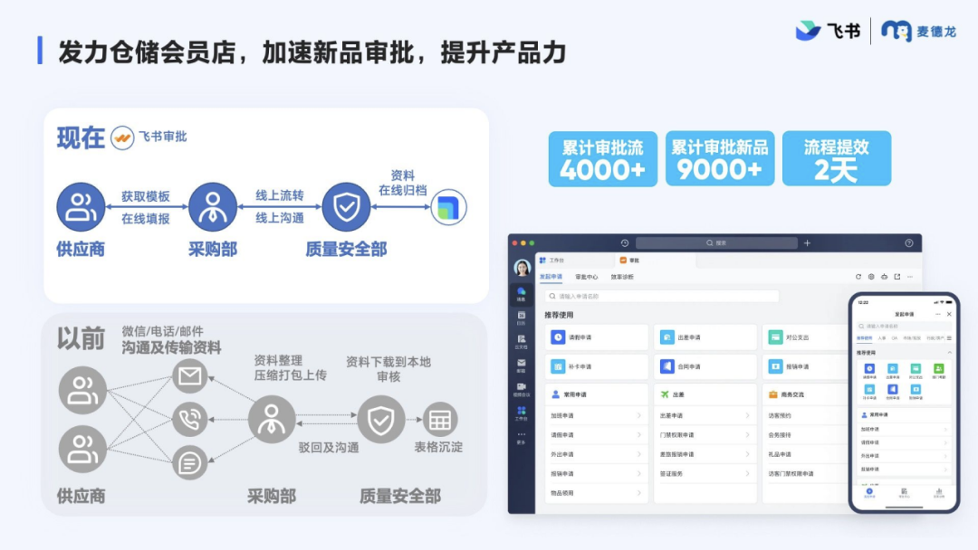 又好比麥德龍,團(tuán)隊(duì)用飛書審批流程打通采購、品控等多個(gè)部門及外部供應(yīng)商,實(shí)現(xiàn)對(duì)新品上線流程全面數(shù)字化。線上審批讓流程的每一環(huán)節(jié)都清晰可視,系統(tǒng)自動(dòng)根據(jù)商品種類匹配不同流程,不必人工調(diào)整。2022年,麥德龍通過飛書累計(jì)完成了近4000個(gè)審批流,審批近9000個(gè)新品,審批全流程效率提升2天以上,大大加快新品上市效率。