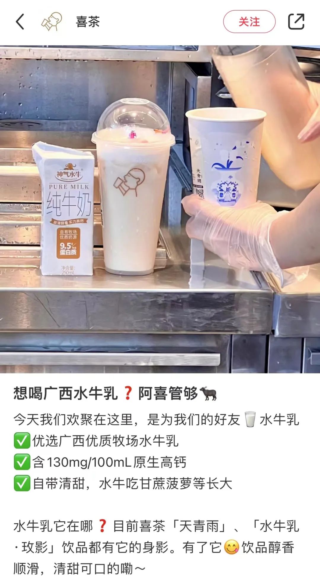 緊接著,喜茶也站上了互聯(lián)網(wǎng)“沖浪”第一線,一則“想喝廣西水牛乳?阿喜管夠”的推文將這件原本只屬于一家品牌的熱鬧擴散到了整片新茶飲市場中。