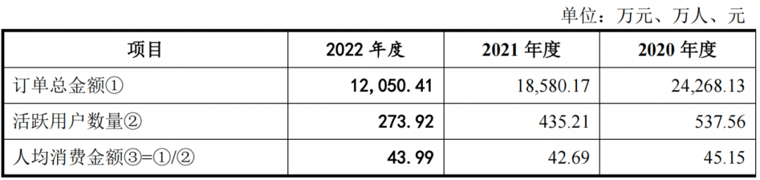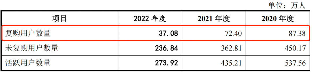 招股書(shū)顯示,報(bào)告期內(nèi),在活躍用戶中,選擇復(fù)購(gòu)的用戶數(shù)量分別為87.38萬(wàn)人、72.40萬(wàn)人、37.08萬(wàn)人,2022年的復(fù)購(gòu)用戶較2021年減少了48.78%。