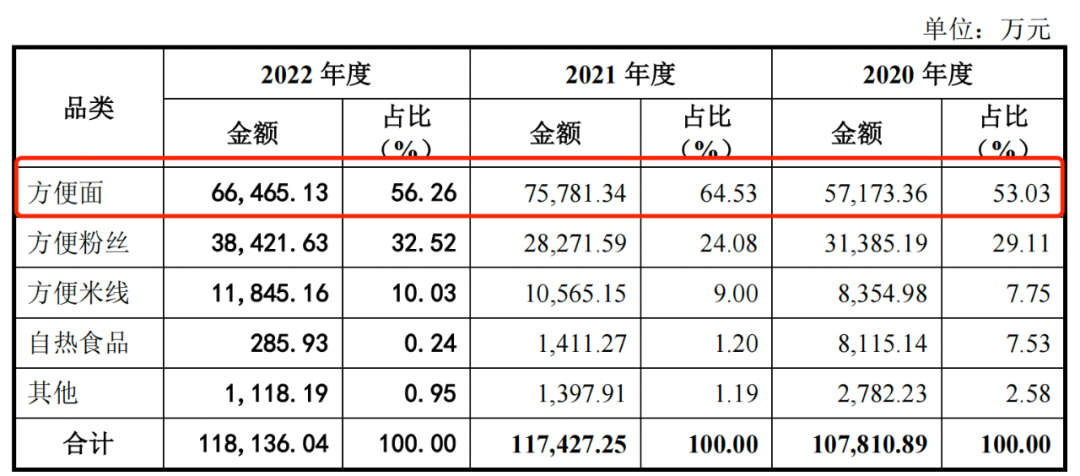 阿寬食品的收入主要集中在以“紅油面皮”為代表的方便面食品上。招股書(shū)顯示,報(bào)告期內(nèi),公司方便面的收入分別為5.72億元、7.58億元、6.65億元,占當(dāng)期營(yíng)業(yè)收入的比例分別為53.03%、64.53%、56.26%。