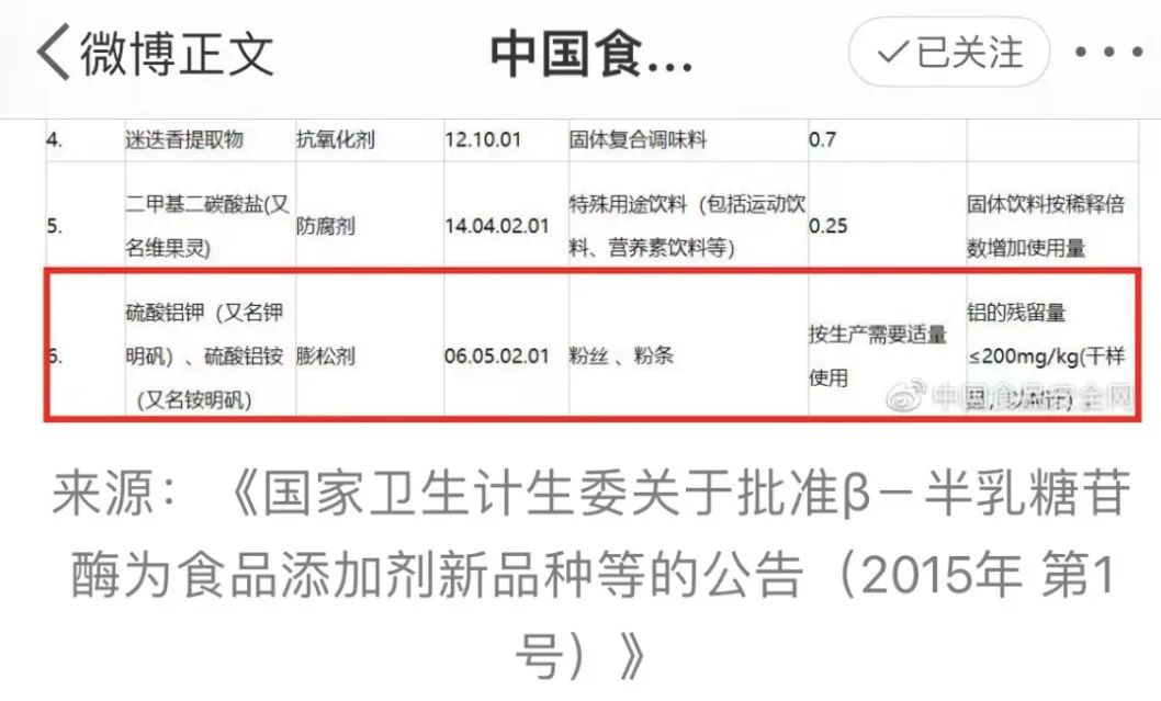 此外,今年中國(guó)食品安全報(bào)發(fā)布的《3.15特別報(bào)道|10款熱銷酸辣粉測(cè)評(píng)》一文中,阿寬食品代工的麻六記酸辣粉、李子柒酸辣粉均被點(diǎn)名,產(chǎn)品被檢測(cè)出來(lái)不但使用的原料不全是其宣傳的純紅薯粉,而且添加了銨明礬。經(jīng)過(guò)添加銨明礬的粉條不僅增加了光澤和彈性,吃起來(lái)更筋道,還能實(shí)現(xiàn)久煮不爛的效果。