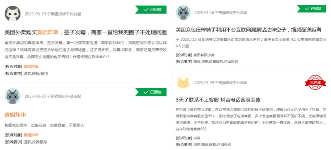 另一邊,部分炸串品牌自身仍執(zhí)著于規(guī);瘮U張,加盟門店狂奔之下,有關(guān)門店食品安全、加盟管理等各種問題頻出。搜索黑貓平臺近一個月內(nèi)有關(guān)炸串品牌的消費者投訴,食材變質(zhì)、不新鮮,吃出蟲子,虛假宣傳的負面信息比比皆是。