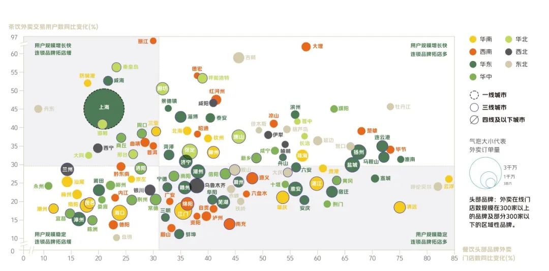 2023上半年下沉市場典型城市新茶飲外賣用戶規(guī)模增速及頭部品牌外賣門店增速四象限圖