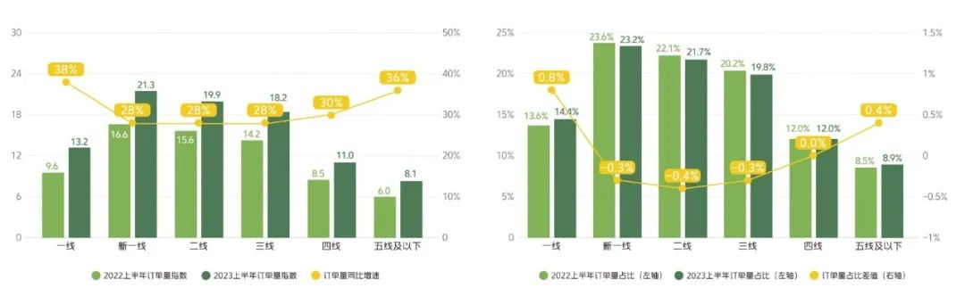 2023上半年美團(tuán)外賣各城市線新茶飲品類訂單指數(shù)及增速