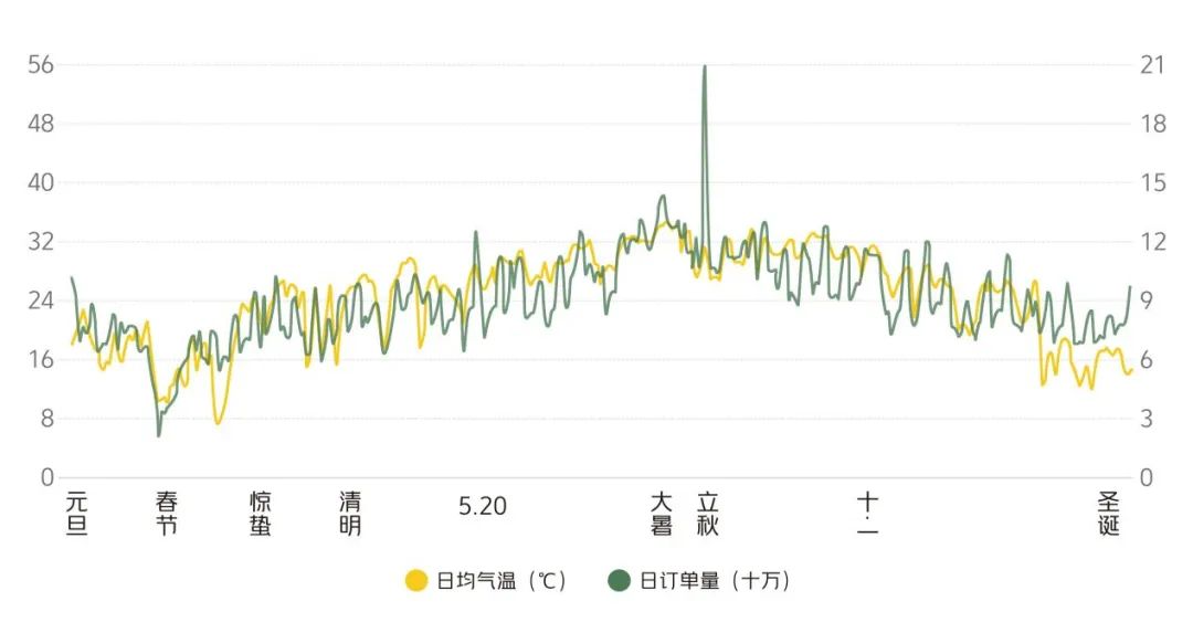 季節(jié)輪轉(zhuǎn)和氣溫變化對(duì)餐飲消費(fèi)選擇有著直接的影響。新茶飲外賣訂單波動(dòng)與氣溫有強(qiáng)相關(guān)關(guān)系。其中,炎熱夏季和寒冷冬季對(duì)新茶飲訂單的影響較為顯著。夏季高溫帶來茶飲增量,秋一杯峰值營銷效果好。