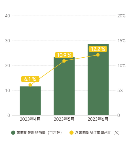 花香方面,“茉莉花香”成為主流產(chǎn)品。2023年4月,“茉莉”相關(guān)新品在美團(tuán)外賣上銷量接近1200萬杯,含“茉莉”相關(guān)新品的訂單占當(dāng)月新茶飲總訂單量的6.1%;至6月“茉莉”相關(guān)新品銷量則超過2800萬杯,占當(dāng)月新茶飲總訂單量也攀升至12.2%。