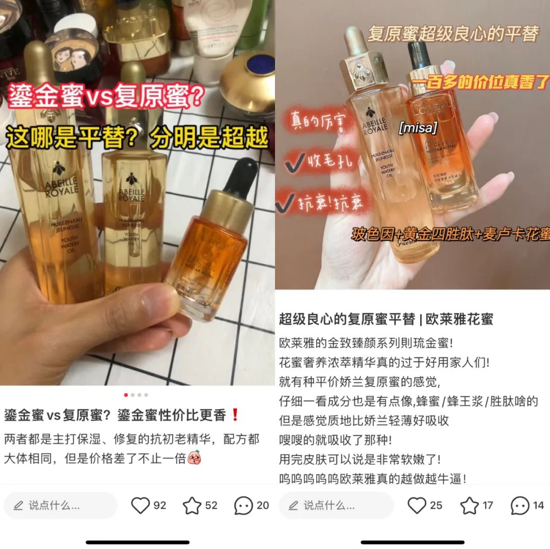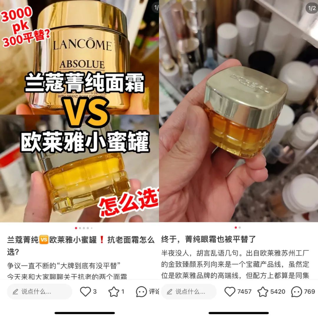 青眼號外注意到,在小紅書等社交平臺上,有部分消費者將歐萊雅金致臻顏花蜜奢養(yǎng)濃萃精華(俗稱:琉金蜜)視為嬌蘭帝皇蜂姿復(fù)原蜜的平價替代品;將歐萊雅金致小蜜罐系列面霜、眼霜視作蘭蔻菁純的平替。