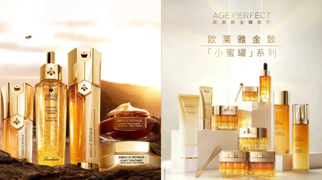 圖左為嬌蘭帝皇蜂姿系列,圖右為巴黎歐萊雅金致小蜜罐系列 分別截自嬌蘭、巴黎歐萊雅官方微博