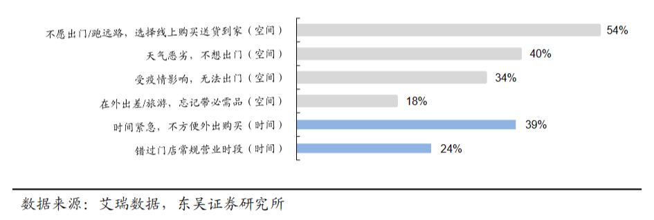 根據(jù)東吳證券2020年的消費(fèi)者調(diào)研顯示,在消費(fèi)者采用即時零售購物的影響因素中,空間維度的因素占比,遠(yuǎn)超過以即時性為主的時間維度。這也意味著和餐飲外賣對于分鐘級送達(dá)時效性的剛需性需求不同,在即時零售場景中,分鐘級時效性可以被更軟性的小時達(dá)服務(wù)取代。