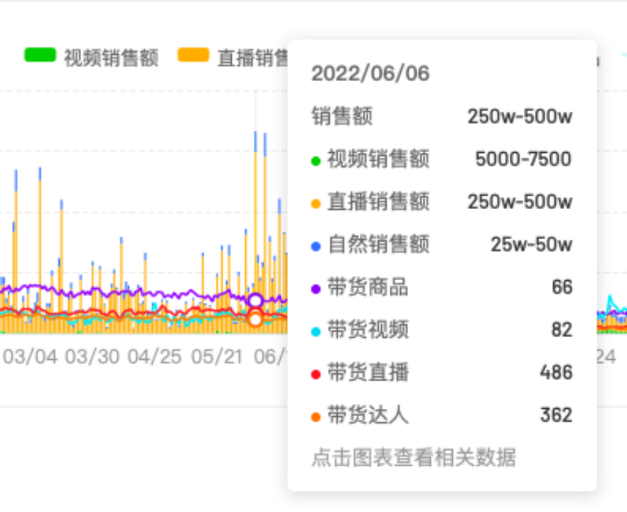 銷量最高峰在6月6日,當(dāng)天投放了362名達(dá)人,雖然達(dá)人投放數(shù)量并不算最高,但銷售額卻創(chuàng)下歷史新高,是250萬-500萬。