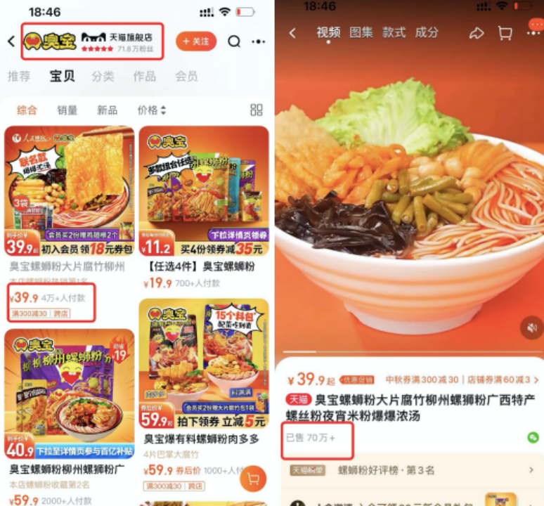 包括臭寶的淘寶旗艦店,雖然粉絲量只有71.8萬,不及李子柒旗艦店的600萬體量,但臭寶螺螄粉39.9元單品月銷量就達(dá)到4萬+,目前為止已售出70萬。