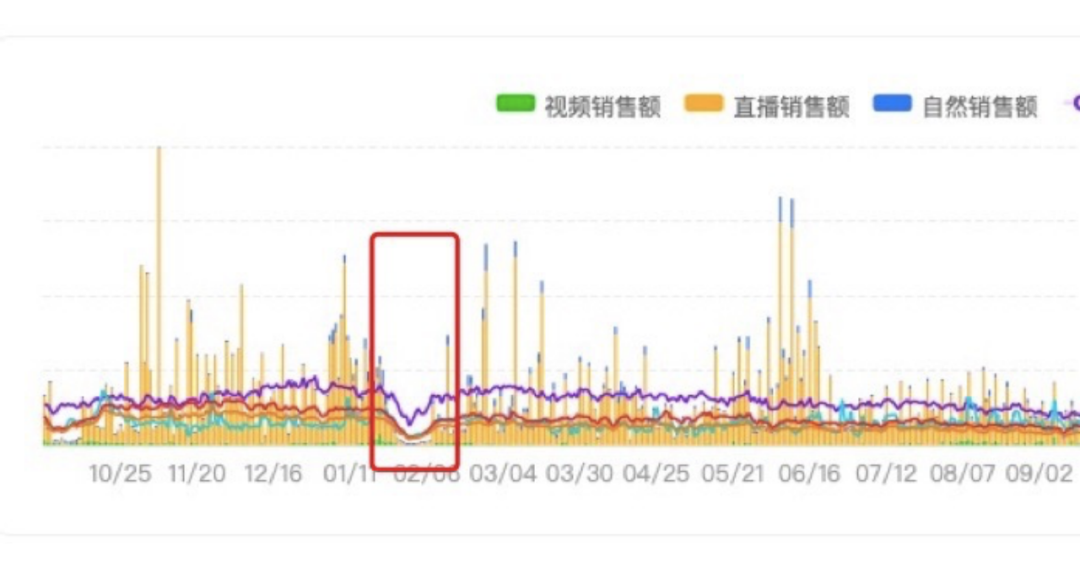 或許是想測試?yán)钭悠馄放普鎸?shí)的銷售水平,從2022年1月27日至2月8日,減少對達(dá)人投放,李子柒的銷售數(shù)據(jù)出現(xiàn)了一個低谷。