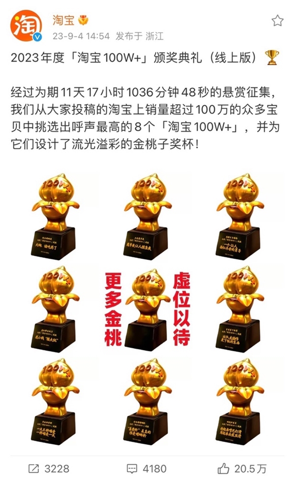 近日,淘寶官方向8個商家頒發(fā)了首屆“淘寶100W+”金桃子獎杯。
