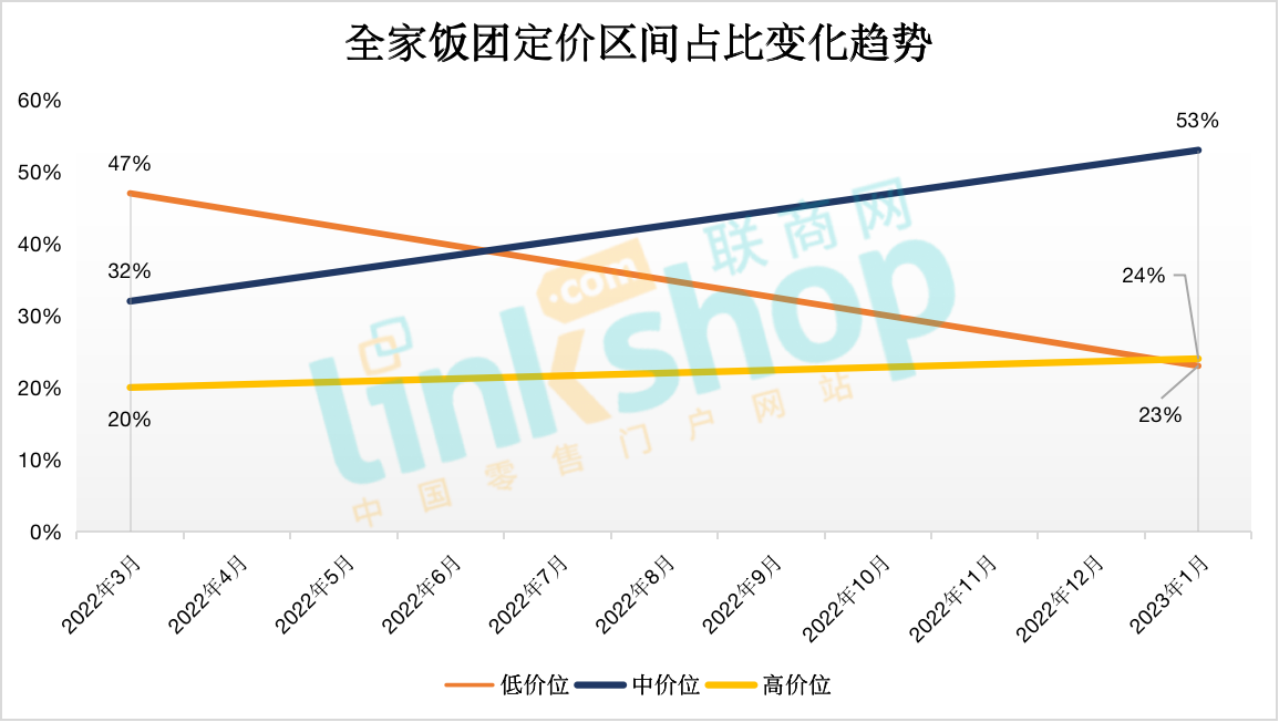 打造差異化的高價格區(qū)間(191日元以上)、創(chuàng)造新銷售高峰促進(jìn)增長的中價格區(qū)間(151至170日元)、穩(wěn)定利潤貢獻(xiàn)最大收益最多的低價格區(qū)間(121日元至140日元),通過以上三個價格區(qū)間的組合,謀求銷售及利潤最大化,結(jié)果是2022年3月至2023年1月三個價格區(qū)間的銷售構(gòu)成比發(fā)生了很大變化,飯團(tuán)日銷售額取得了每月同比增長超過100%的成果。具體如下圖所示: