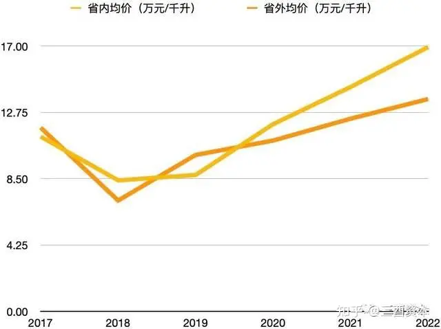 但在全國(guó)化如火如荼開(kāi)展的過(guò)程中,汾酒也并非毫無(wú)煩惱。其中,高端化與全國(guó)化戰(zhàn)略便無(wú)法統(tǒng)一進(jìn)行。從下圖中可以看出,省內(nèi)均價(jià)長(zhǎng)期持續(xù)壓制省外均價(jià)上行。