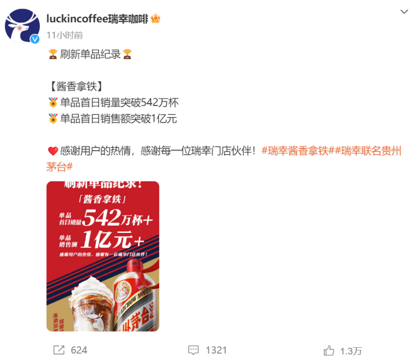 而在線(xiàn)上,“醬香拿鐵”、“瑞幸回應(yīng)喝茅臺(tái)聯(lián)名咖啡能否開(kāi)車(chē)”、“滿(mǎn)杯茅臺(tái)去咖啡液”、“瑞幸客服回應(yīng)醬香拿鐵不加咖啡液”等多個(gè)相關(guān)話(huà)題沖上微博熱搜,成功出圈,讓人們見(jiàn)面問(wèn)候語(yǔ)也變成了“有沒(méi)有嘗試一下醬香拿鐵”?