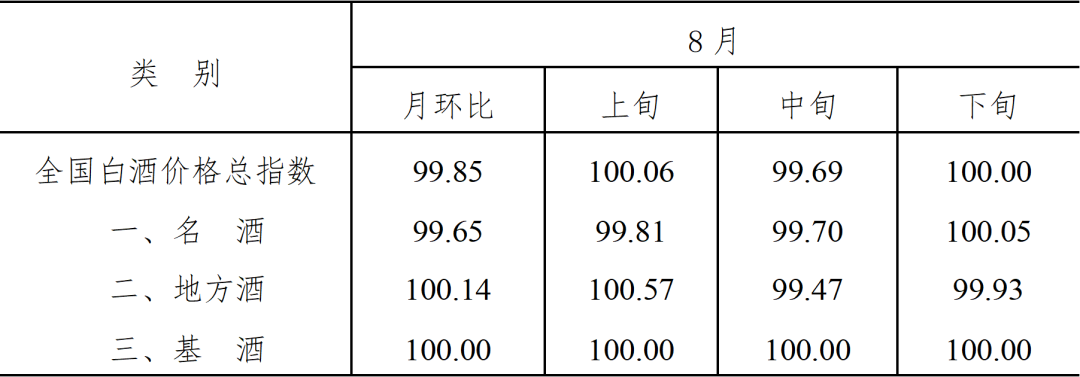 2023年8月全國(guó)白酒價(jià)格月、旬價(jià)環(huán)比指數(shù)表