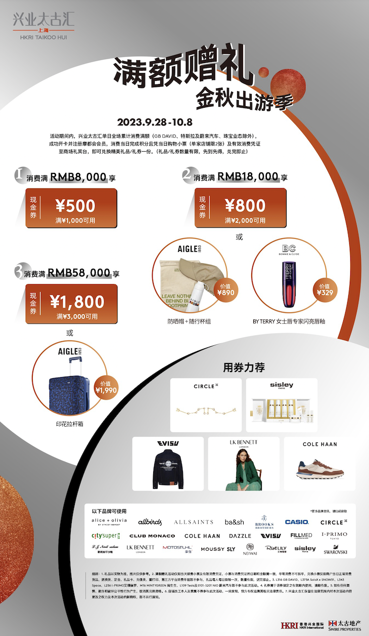 釋放假日購物需求,整個“Dare To Autumn”活動季期間,興業(yè)太古匯更聯(lián)動全域商戶為消費者奉上假日禮遇。9月28日至10月8日,消費者單日消費滿額可獲得不同檔位贈禮,最高可享單日消費滿58,000元獲贈1,800元零售現(xiàn)金券或超值禮品。9月15日至10月8日,參與樂游云購9·17、“喀什美食節(jié)”、ChiLL低碳生活節(jié)、《消失的法老》任一活動的摩都會會員,均有機會領(lǐng)取或積分兌換餐飲/零售品牌福利包和餐飲專享現(xiàn)金券,讓消費者在體驗繽紛活動的同時,也能獲享消費福利,暢享假日購物樂趣。
