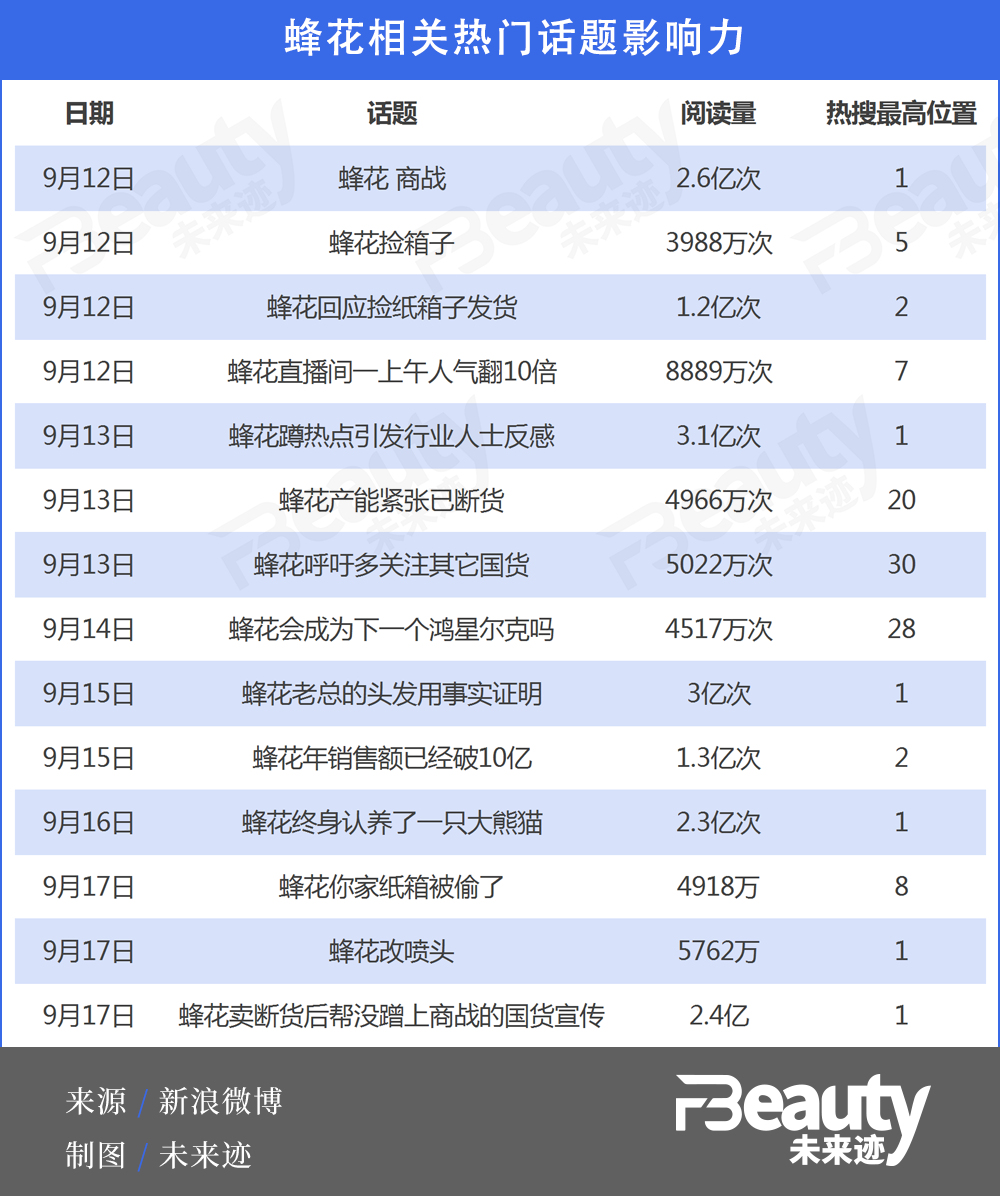 據不完全統(tǒng)計,從9月11日到9月17日的一周之內,蜂花至少17次登上熱搜,且多次登上熱搜第1。這些熱門話題的總閱讀量已經超過20億次。