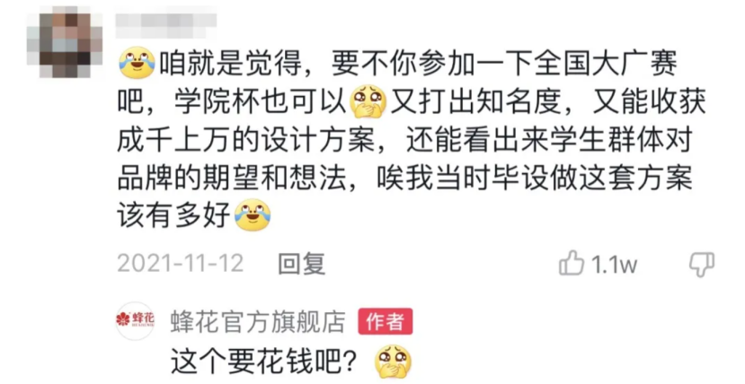早在2021年雙11期間,蜂花因為“包裝丑”遭到吐槽,有網友建議蜂花去參加“全國大廣賽”以獲取“成千上萬的設計方案”。結果蜂花回了一句“這個要花錢吧?”,這成功引發(fā)了網友的調侃之心,關于“蜂花倒閉”的傳言四起。