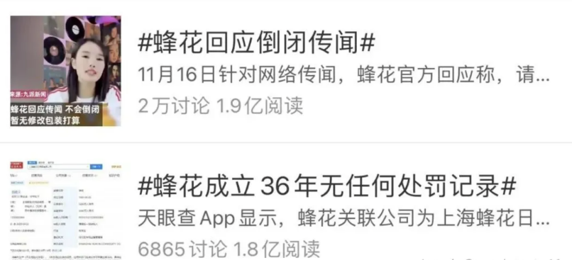 2022年5月,上海疫情期間#蜂花老板含淚親自直播,一直受外資企業(yè)打壓,37年無違規(guī),10年來僅僅漲價2元錢# 等話題再次登上熱搜。緊接著衍生出 #蜂花主播說沒見過這么大場面#、#蜂花回應再次走紅# 等一系列話題沖上熱搜,累計閱讀量超4億。