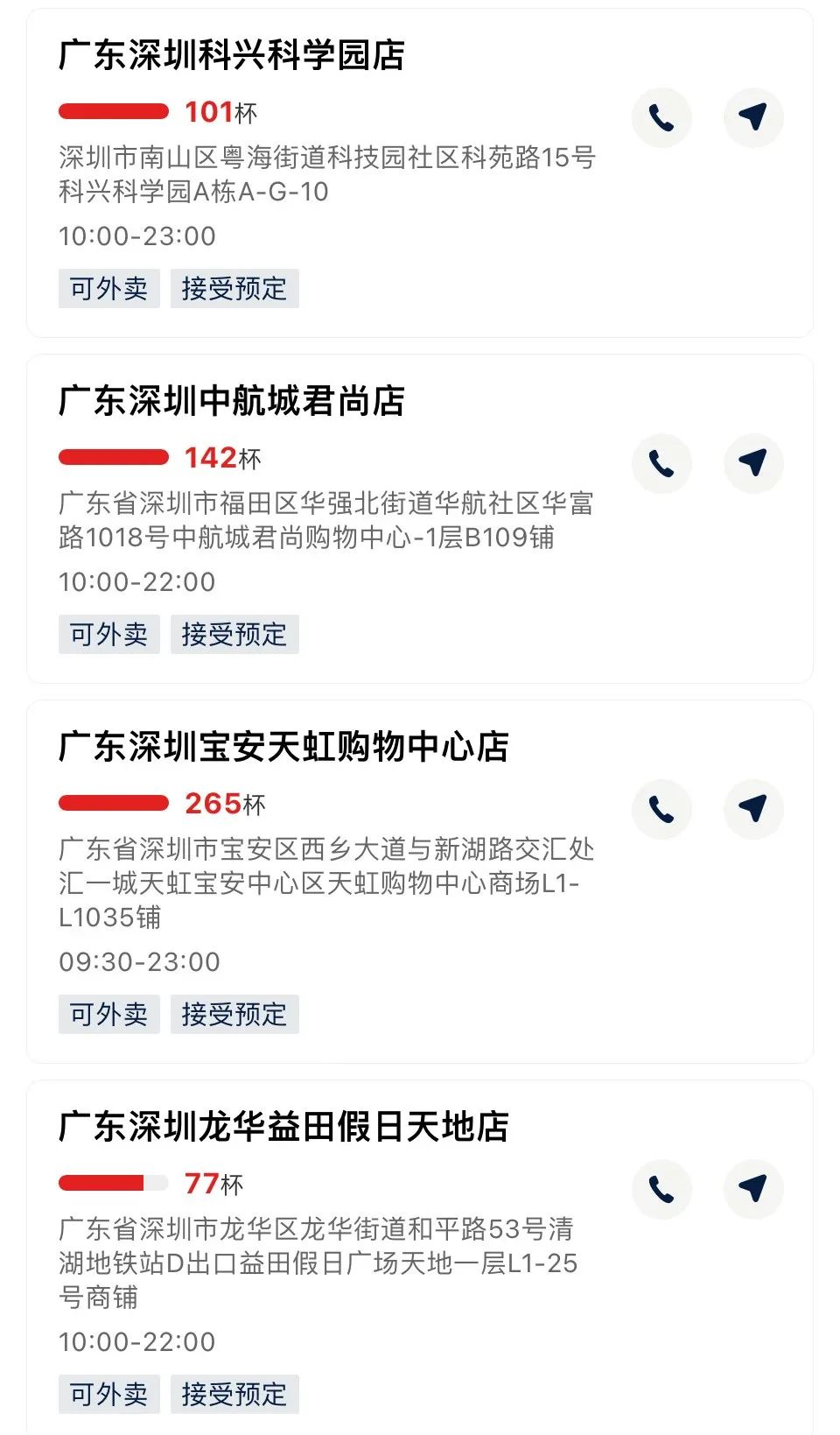 筆者上周三下午3點(diǎn)多打開霸王茶姬點(diǎn)單小程序,發(fā)現(xiàn)不少門店都是“爆單狀態(tài)”,比如科興科學(xué)園店101杯、龍崗天安云谷店285杯、中航城君尚店142杯、寶安天虹購(gòu)物中心店265杯,很夸張。