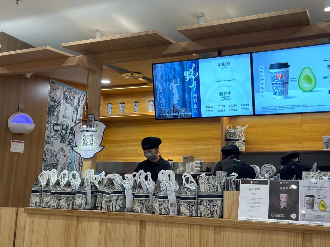 霸王茶姬門店整體設(shè)計(jì)強(qiáng)調(diào)東方美學(xué),以木質(zhì)構(gòu)店、篆書飾墻的中國(guó)風(fēng)為主。