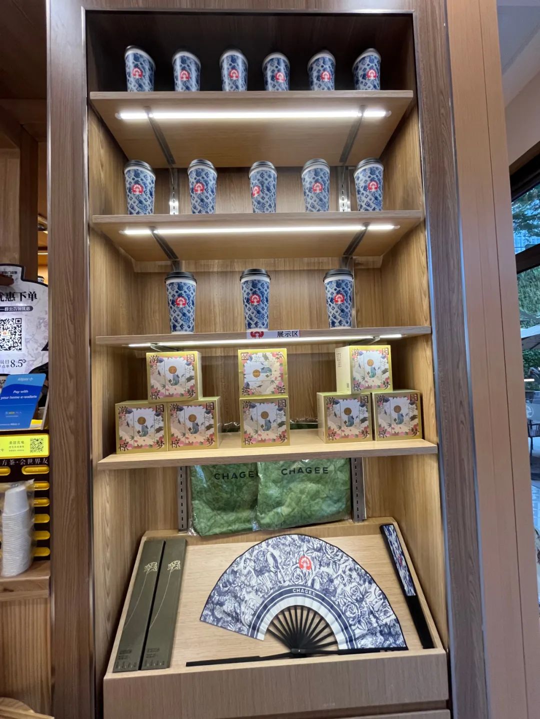 進(jìn)門口右側(cè)是展示區(qū),擺放有霸王茶姬的紙杯和一些原創(chuàng)周邊,比如游園驚夢(mèng)袋泡茶、茶馬古道扇子等。旁邊的桌子上擺有冰鎮(zhèn)的茶壺和試喝杯,供消費(fèi)者試喝奶茶。