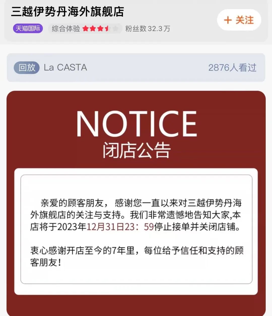而伊勢丹海外旗艦店最終沒能走過“七年之癢”。近日,伊勢丹海外旗艦店發(fā)布閉店公告,宣布將于2023年12月31日停止接單并關(guān)閉店鋪,全店商品買一贈一。