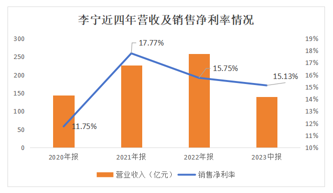 8月11日,李寧發(fā)布2023年上半年業(yè)績報告,報告期內錄得營收140.19億,同比增長13%;但凈利率卻同比減少3.11%至21.21億元。而這,也是自2020年中報以來李寧首次出現(xiàn)的凈利負增長。