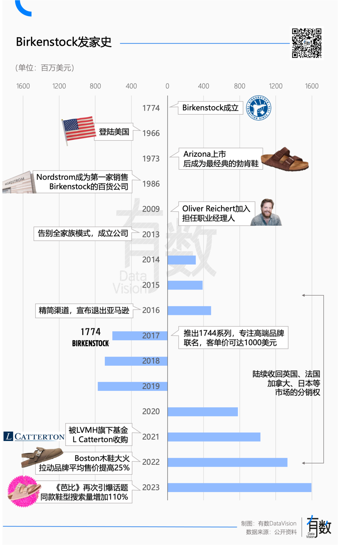 同樣是背負(fù)了“丑鞋”的罵名,Birkenstock的日子卻比Crocs順風(fēng)順?biāo)亩啵鹤?013年經(jīng)營走上正軌后,營收一路高漲,從不到3億歐元漲到了如今的12億。