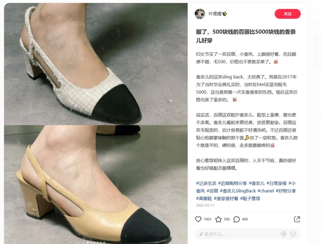 “服了,500塊錢的百麗比5000塊錢的香奈兒好穿”。據(jù)小紅書網(wǎng)友透露,自己曾為了畢業(yè)典禮重金買下香奈兒小高跟,又在幾個月前買了百麗幾乎龍鳳胎的同款鞋。雖說香奈兒很明顯看起來更經(jīng)典、皮質(zhì)更耐穿,但百麗這個同款貼心地給腳掌接觸的面加了一層軟墊,彌補(bǔ)了香奈兒走路多腳疼的缺陷。