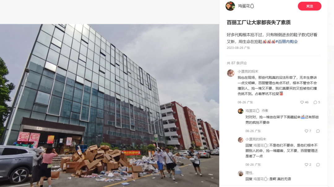 很多親自去搶鞋的網(wǎng)友也反饋,根本搶不過那些專門來代購百麗的黃牛。工作人員剛用紙箱把鞋子倒出來,就已經(jīng)有人撲上去瘋搶了。