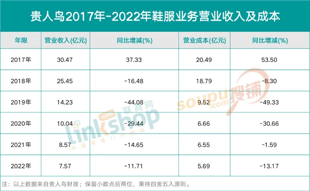 《聯(lián)商網(wǎng)》統(tǒng)計了貴人鳥2017年至2022年鞋服業(yè)務的營業(yè)收入及成本,從中可見,自2018年以來,鞋服業(yè)務營業(yè)收入連年下降,與此同時,貴人鳥對于鞋服業(yè)務的成本付出也在不斷下降。