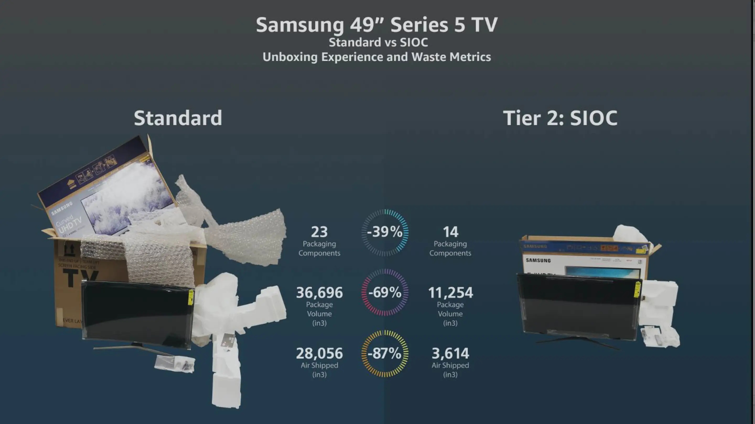 例如對于三星的一款電視,亞馬遜為其減少了9個(gè)不必要的包裝組件,使包裝體積顯著減少了 69%。與標(biāo)準(zhǔn)包裝相比,直接減少了87%的空氣運(yùn)輸。