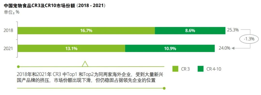 盡管國內寵物市場參與玩家眾多,但行業(yè)同質化競爭正加劇,缺少擁有絕對競爭力的頭部本土品牌。亞寵研究院《2022寵物行業(yè)藍皮書》顯示,2021年我國寵物市場份額前10的企業(yè)市占率均為個位數,且其中本土僅有華興、中寵兩家老牌企業(yè)在列,二者都是代工起家,旗下品牌力狼、Wanpy頑皮雖也有一定名氣,但市占率依然不足3%。因此,當前本土新銳品牌想要脫穎而出,著重打出特色心智或許更具可操作性。