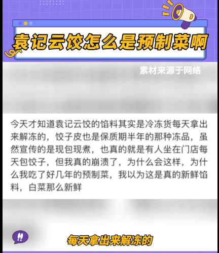 袁記云餃亦是,主打一個現(xiàn)包現(xiàn)煮,雖然真的有人每天坐在店里包云餃,但實際上材料都是在廣東制作完成,冷凍發(fā)到各地(餡料同皮都是中央廚房配送,皮的保質期約2個月,肉餡約半年),解凍包好再賣出,至于解凍材料的環(huán)節(jié)自然是回避了食客們的。