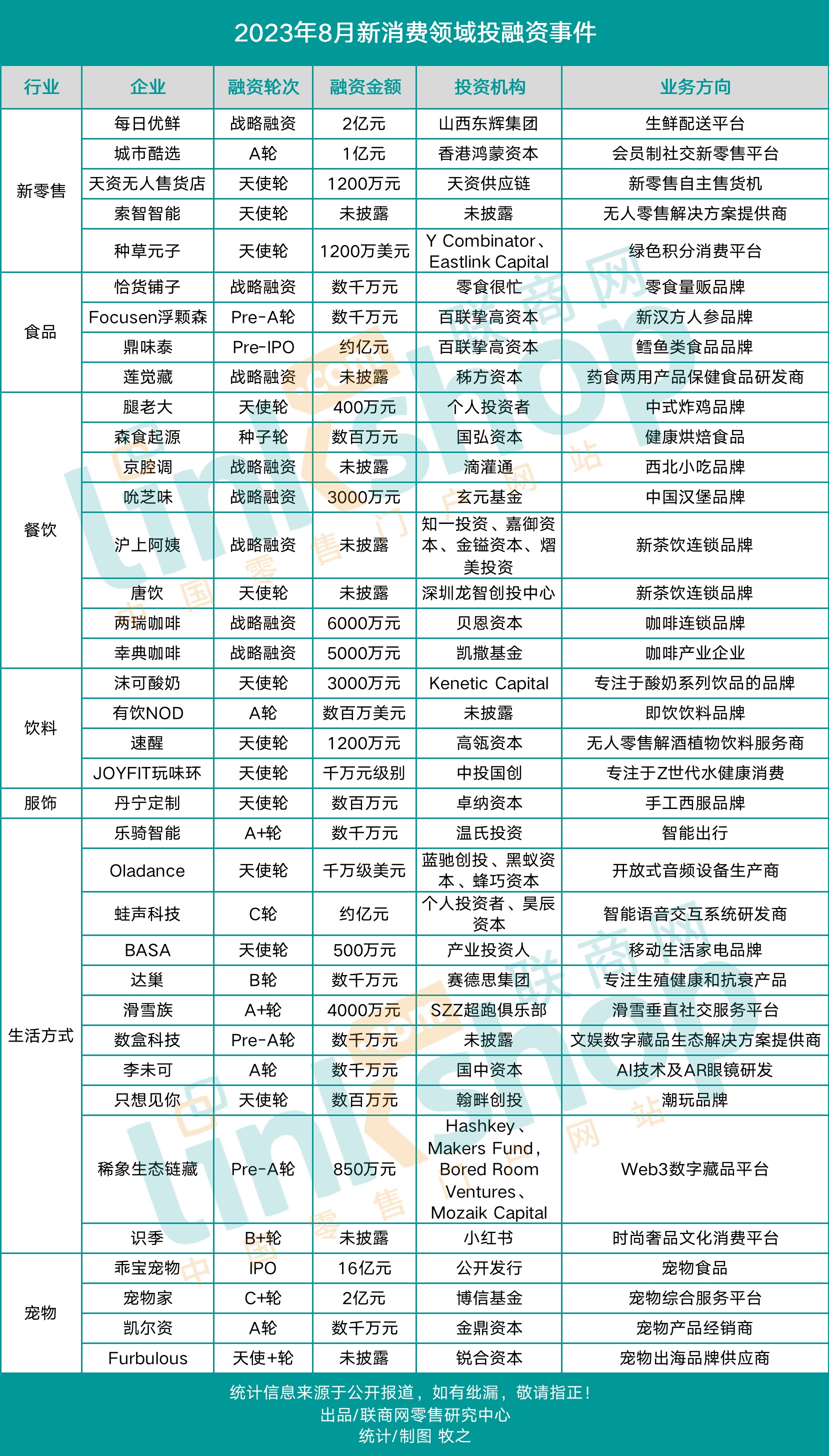 其中,乖寶寵物IPO獲得16億元融資,也是8月份新消費領(lǐng)域最大的一筆融資。每日優(yōu)鮮和寵物家緊隨其后,均獲得2億元融資;城市酷選獲得1億元融資,鼎味泰和蛙聲科技均獲得約億元融資。億元級別融資涵蓋生活方式、新零售、食品、寵物等賽道。