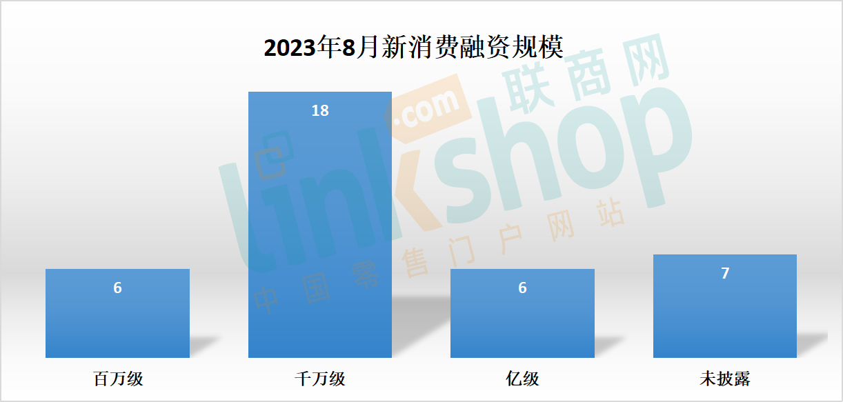 據(jù)聯(lián)商網(wǎng)零售研究中心不完全統(tǒng)計,8月份新消費領(lǐng)域共發(fā)生37起融資事件,融資總金額約30億元人民幣(融資金額模糊處理原則:數(shù)十萬元=50萬元,數(shù)百萬元=500萬元,數(shù)千萬元=5000萬元,數(shù)億元=5億元;百萬級=100萬元,千萬級=1000萬元;億元級=1億元,外幣已按匯率換算,未披露融資金額未計入,融資時間以披露時間為主)。