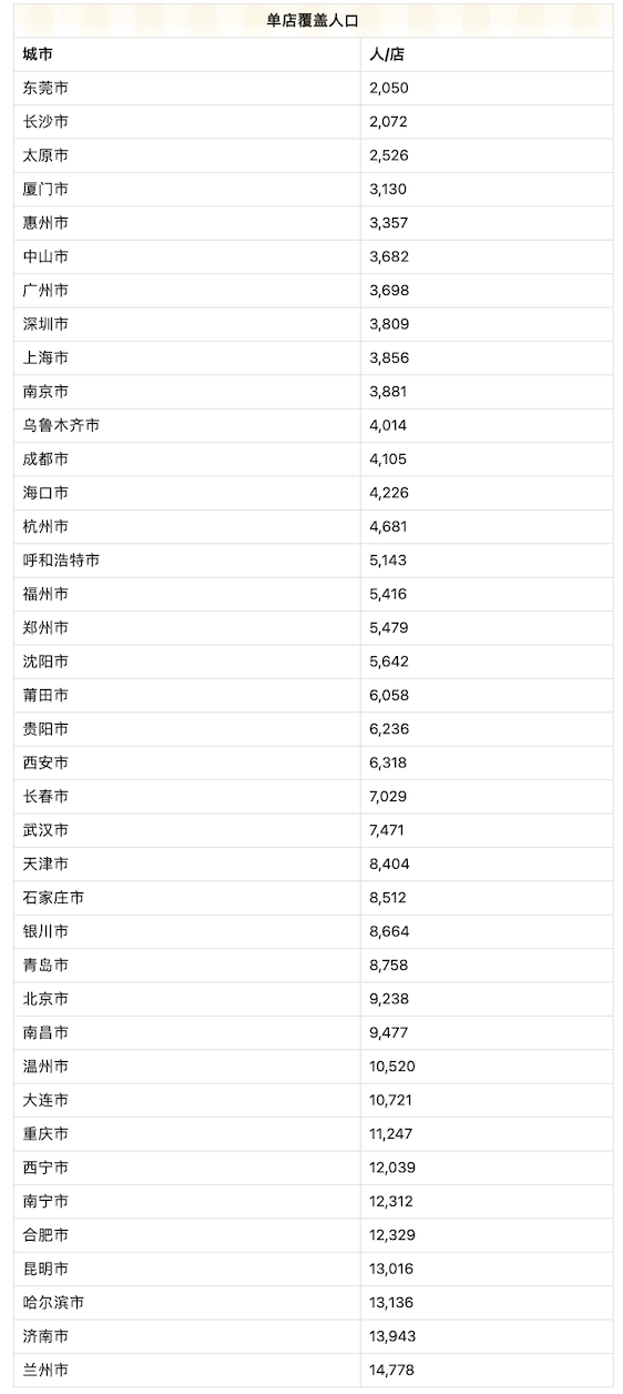 單店覆蓋人口=該城市總?cè)丝跀?shù)/該城市門店總量