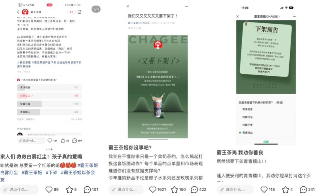 積極回應(yīng)消費(fèi)者訴求,原本是霸王茶姬做的較為出色的環(huán)節(jié),但從運(yùn)營(yíng)手段上來(lái)看,霸王茶姬要做的卻似乎不止如此。在2022年年末,霸王茶姬選出,青沫觀音、白霧紅塵、貴馥蘭香、青青糯山四款產(chǎn)品,讓粉絲投票,獲得投票較少的產(chǎn)品,將被下架。