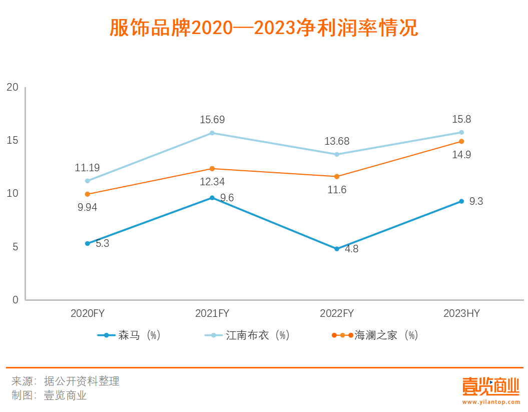 另一方面,從凈利潤來看,財報顯示森馬2020—2022年及2023年上半年凈利潤率分別為5.3% ,9.6% ,4.8%,9.27%,江南布衣則為11.19%、15.69%、13.68%、15.75% ,森馬與之相比并不占優(yōu),而海瀾之家近四年凈利潤率則是9.94%、12.34%、11.6%、14.9%森馬凈利潤率遠(yuǎn)低于同類企業(yè)。
